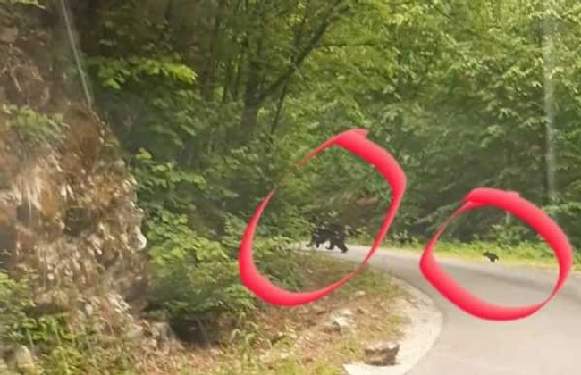 O ursoaică şi doi pui le-au ieşit în cale jandarmilor. Animalele nu erau agresive. Se aflau pe marginea drumului, unde mâncau hrana lăsată de oamenii care au vizitat zona.