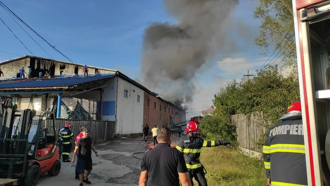 Peste 60 de pompieri au intervenit pentru stingerea unui incendiu la un depozit de cartofi şi îngrăşământ chimic din Miercurea-Ciuc