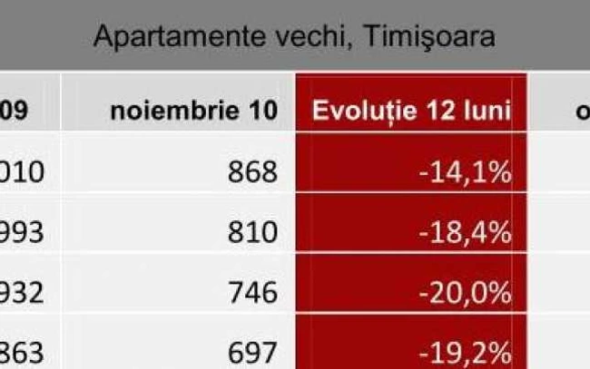 Preţurile medii ale apartamentelor din Timişoara sunt în continuare cele mai mici preţuri înregistrate la nivel naţional, în rândul oraşelor mari, conform unei analize realizate de imobiliare.ro, unul dintre portalurile de specialitate. Comparativ cu aceeaşi perioadă a anului 2009, tarifele practicate acum de proprietarii şi dezvoltatorii imobiliari timişoreni sunt mai mici cu peste 18 procente. Doar în ultima lună, preţurile vechi au mai scăzut cu mai bine de două procente, ajungând la o medie de 776 de euro pentru metru pătrat util.
