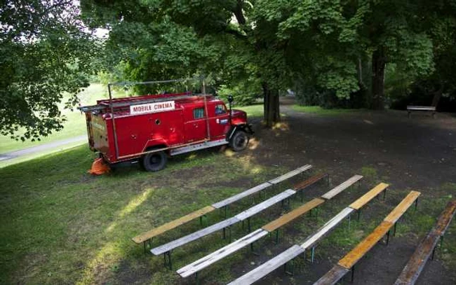 Cinematecă mobilă dintr-o maşină veche de pompieri în Piaţa Libertăţii din Timişoara
