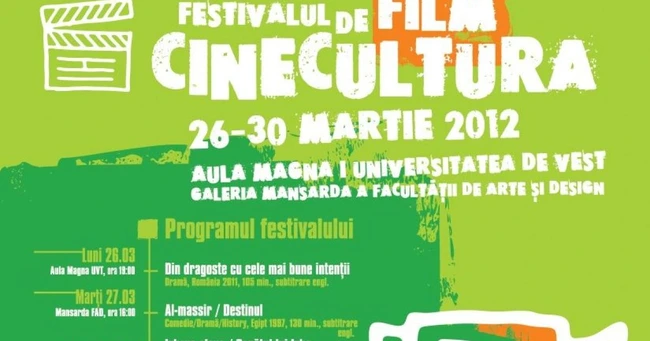 De luni şi până vineri, în Aula Magna „Ioan Curea" a Universităţii de Vest sau în Galeria „Mansardă" din cadrul Facultăţii de Arte şi Design din Timişoara, cinefilii pot viziona nu mai puţin de 12 pelicule. Festivalul începe în această seară cu filmul româno-maghiar Din dragoste, cu cele mai bune intenţii şi continuă astăzi, de la ora 16.00, cu pelicula egipteană Le Destin, la Facultatea de Artă. De la ora 18.00, în Aula Magna a Universităţii de Vest, rulează filmul sârbesc Ivkova slava, iar de la 20.00 Labirintul lui Pan.