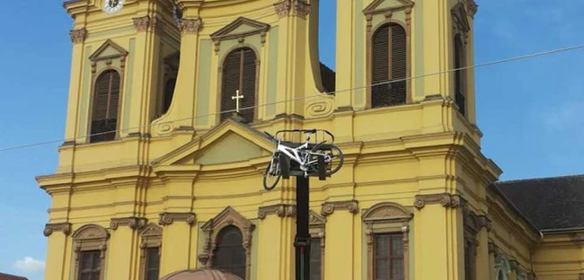 Un muncitor de pe şantierul din Piaţa Unirii a găsit o metodă antifurt inedită. Acesta a ridicat bicicleta cu braţul unei macarale, pentru a fi sigur că nimeni nu va putea să atenteze la vehiculul său.