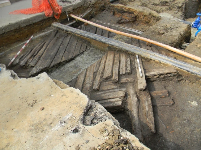 Arheologii au descoperit o casă de lemn, la aproximativ un metru sub suprafaţa carosabilă care a fost spartă. Este vorba de o locuinţă care a fost probabil distrusă în timpul asediului din 1716, deoarece pe podeaua de lemn (păstrată partial) a fost descoperit un fragment de ghiulea de fontă; locuinţa era orientată paralel cu strada medievală ce a fost surprinsă în imediata apropiere (cu orientare NNV-SSE). Tot în aceeiaşi zonă a fost găsită podirea cu lemn a ceea ce pare a fi o stradă medievală.