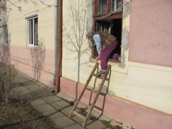 Pentru a putea ieşi din casă, Ioan şi Aglaia Dimistrian, doi pensionari de 70, respectiv 65 de ani, scot scara din casă, o proptesc de geam şi, cu destul efort, coboară în stradă.
