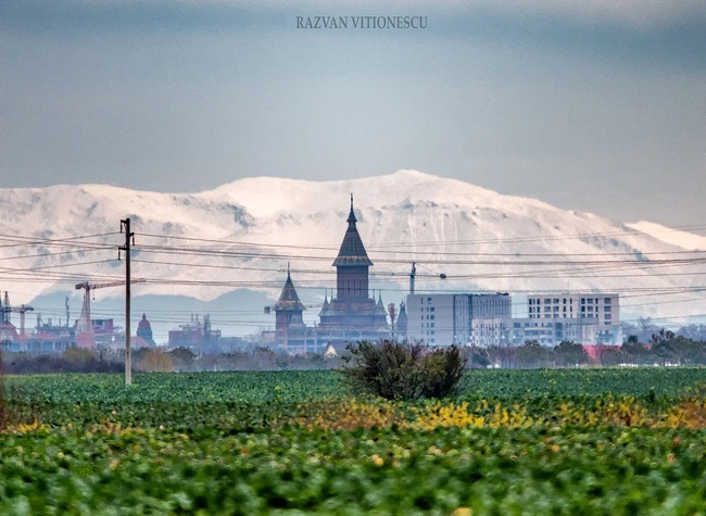 „Absolut fabulos! Munții Țarcu văzuți în spatele Catedralei din Timișoara. Am reușit să surprind cadrul mult visat”, și-a anunțat Vitionescu urmăritorii de pe Facebook.