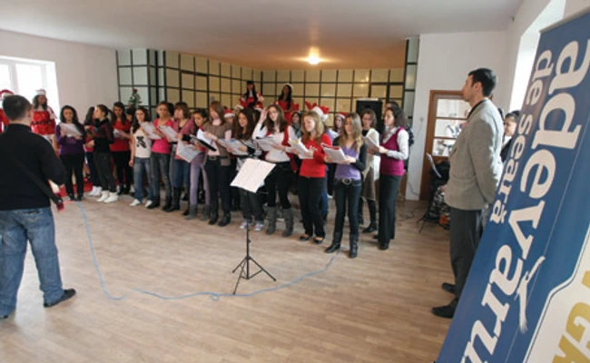 Crăciuniţe drăguţe i-au condus pe invitaţi spre o sală amenajată în spiritul evenimentului, unde un cor format din elevi i-a colindat chiar şi în limba engleză. A urmat un spectacol de dansuri populare româneşti, sârbeşti şi chiar bulgăreşti.