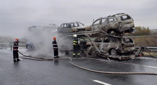 0Un camion care transporta mai multe maşini Dacia Duster pe Autostrada A1, dinspre Deva spre Nădlac, a luat foc în zona localităţii Traian Vuia din judeţul Timiş.