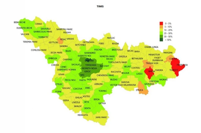 Harta vaccinării împotriva COVID în Timiş. La Dumbrăviţa s-au imunizat cei mai mulţi, cei mai puţini sunt în estul judeţului
