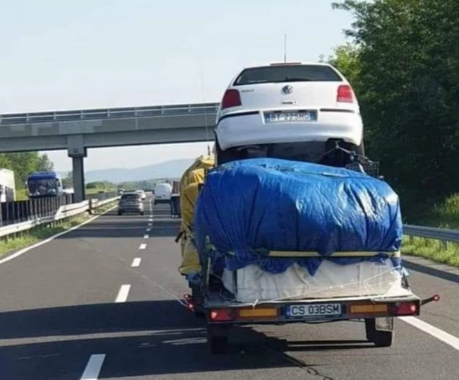 Iată că un alt şofer român a devenit subiect de glume în ţara vecină. De această dată, şoferul a fost fotografiat circulând pe Autostrada M7, tractând o platformă încărcată până la refuz de bajaje. Pe bagaje a fost urcată şi maşină Volkswagen Polo.