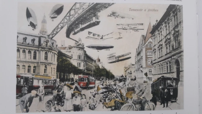 0Cartea poştală realizată la începutul anilor 1900 poartă titlul „Timişoara în viitor”, cu descrierea „Ilustrată umoristică, cu mijloace de transport fantastice pe calea Hunyadi (azi bulevardul 16 decembrie 1989) care despărţea cartierele Elisabetin şi Iosefin”.