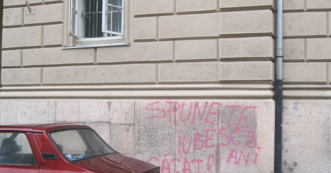 M. Corina, de 41 de ani, din Timişoara, a fost surprinsă de poliţiştii locali în timp ce scria pe pereţii tribunalului: „Spune te iubesc 8 ani! C*c*t!“. Femeia a fost sancţionată cu 200 de lei, conform legii. Timişoreanca a declarat că a făcut acest lucru în semn de protest.