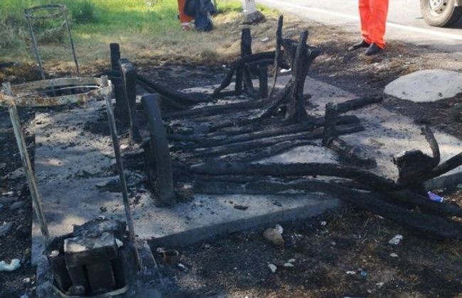 “O nouă mostră de civilizaţie oferită de unii participanţi la trafic pe DN 6, km 468+500, Jupa - Constantin Daicoviciu, judeţul Caraş-Severin. Mobilierul din parcare a fost distrus (incendiat). O imagine care face cât 1000 de cuvinte", au scris cei de la DRDP.