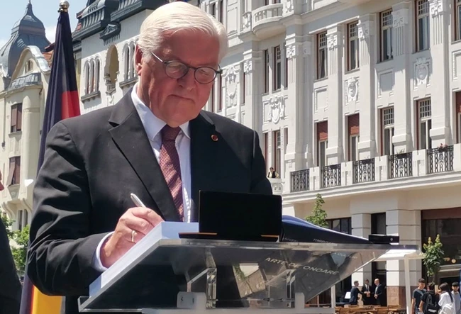 După Sinagogă, Frank-Walter Steinmeier a poposit din nou în Piața Victoriei, unde a semnat în Cartea de Onoare a Primăriei Timișoara. Aici a făcut și singura declarație publică din periplul bănățean.