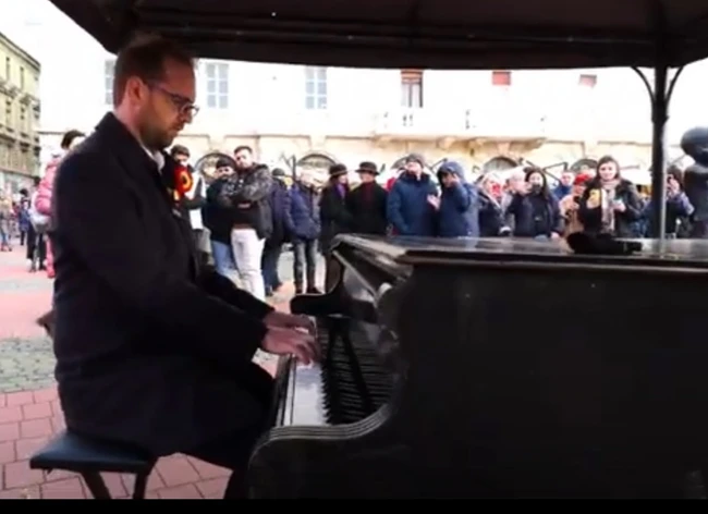 Primarul Dominic Fritz interpretează imnul României la pian, în Piața Libertății din Timișoara VIDEO