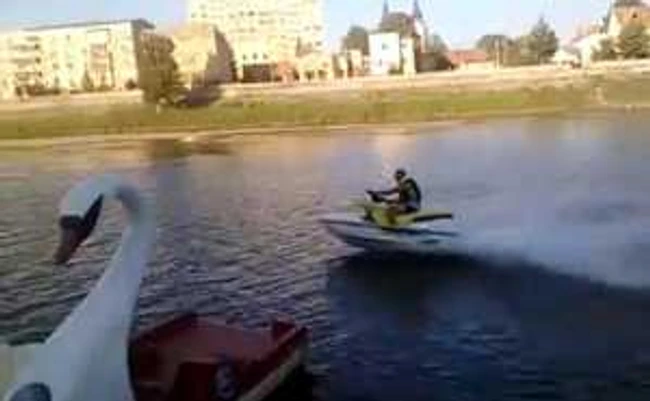 Cei prezenţi în week-end pe malul Timişului, din zona centrală a Lugojului, au avut parte de un spectacol de prost gust făcut de un teribilist călare pe un jet ski. Deşi legea interzice aceste ambarcaţiuni pe apă, lugojeanul nu a ţinut cont de nimic, nici de persoanele care făceau baie, nici de pescari, dar nici de cei care se aflau pe rău cu caiacul.