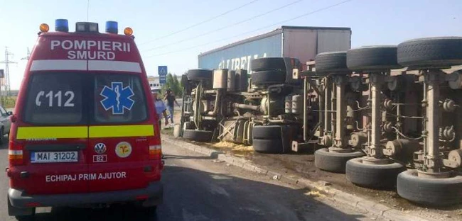 Camionul cu nisip mergea din Timişoara spre Şag. Accidentul a avut loc chiar în sensul giratoriu de pe care se iese spre Real şi Praktiker. Se pare că şoferul a făcut o manevră bruscă, iar camionul de mare tonaj nu a mai putut fi controlat şi s-a răsturnat pe o parte.