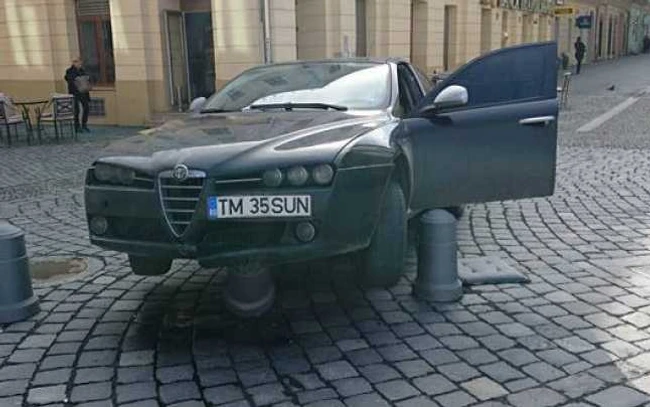 0Şoferul unui autotusim Alfa Romeo a reuşit performanţa să îşi „parcheze“ maşina pe una din stâlpişorii care blochează şoferii să intre în Piaţa Unirii din Timişoara.