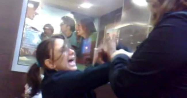 Din discuţia fetelor se înţelege că cearta este provocată de un băiat, Andrei, pe care fetele şi-l dispută. „Cine te crezi să spui că l-ai împărţit cu mine ?", întreabă fata mai solidă în timp ce băieţii care o încurajează să fie agresivă folosesc din nou un limbaj vulgar. După aceste moment fata care stă pe scaun este luată la palme în timp ce încearcă să se apere. Scena se petrece şi sub privirile altor două fete, care stau la masă cu adolescenta agresată şi care nu par mişcate de experienţa prin care trece prietena lor. Cele două fete se amuză chiar de întreaga situaţie. Scena filmată durează puţin peste două minute. Deşi locul în care s-au petrecut aceste scene este unul public, niciun adult nu a intervenit pentru a calma spiritele.