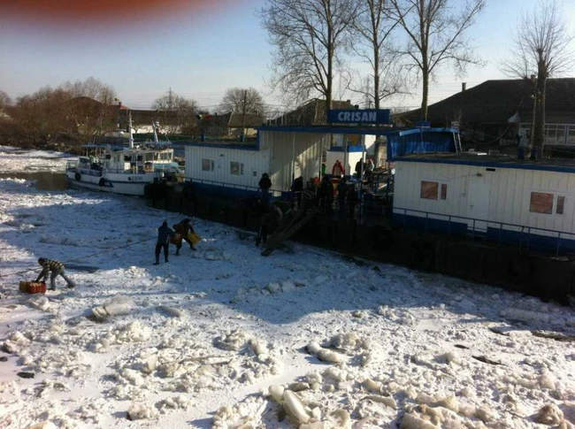 Imaginile surprinse ieri de un militar de pe remorcherul Marinei, „Grozavul“ , sunt destul de înfiorătoare. Mai mulţi bărbaţi formează un lanţ uman chiar deasupra apelor îngheţate ale Dunăprii, între pontonul de acostare din localitatea Crişan şi nava ce a adus alimente.Datorită podului de gheaţă nava militară nu se poate apropia foarte mult de mal, riscând să strivească pontonul de acostare prin presiunea sloiurilor.