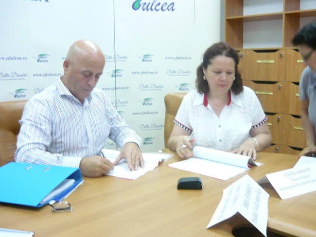 Luminiţa Mihailov, director al Asociaţiei de Dezvoltare Sud – Est şi preşedintele CJ Tulcea, Horia Teodorescu sunt cei care au semnat contractul de finanţare, după ce au prezentat, pe scurt, obiectivele investiţiei şi evoluţia proiectului.