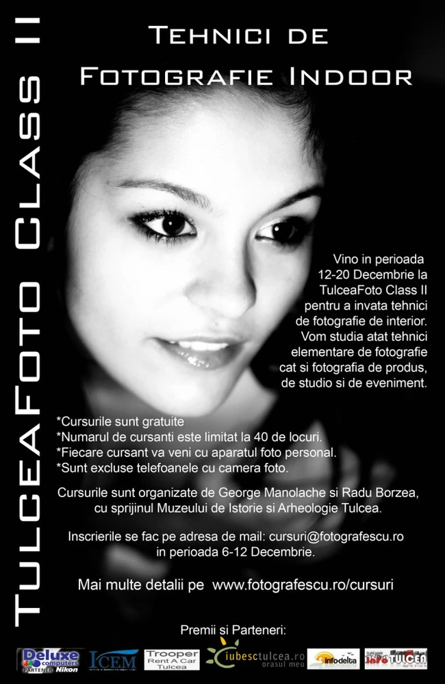Tulcea Foto Class II începe pe data de 12 decembrie şi durează până pe 20 decembrie. Data limită a înscrierilor este prima zi a cursurilor. Oricine pasionat foto se poate înscrie, trimiţând un e-mail pe adresa : cursuri@fotografescu.ro în care trebuie specificat numele, un număr de telefon şi modelul de aparat foto cu care va participa.