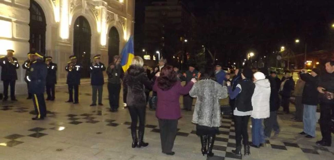 Pe platoul din faţa Palatului Culturii „Teodor Costescu”, cu puţin înainte de începerea spectacolului, severinenii s-au prins în horă, pe acordurile fanfarei oraşului. A fost un moment deosebit de emoţionant, mai ales că în horă au intrat şi prichindeii de la grădiniţa nr. 20 din municipiul Drobeta Turnu Severin, îmbrăcaţi în costume populare, alături de părinţii şi educatorii lor.