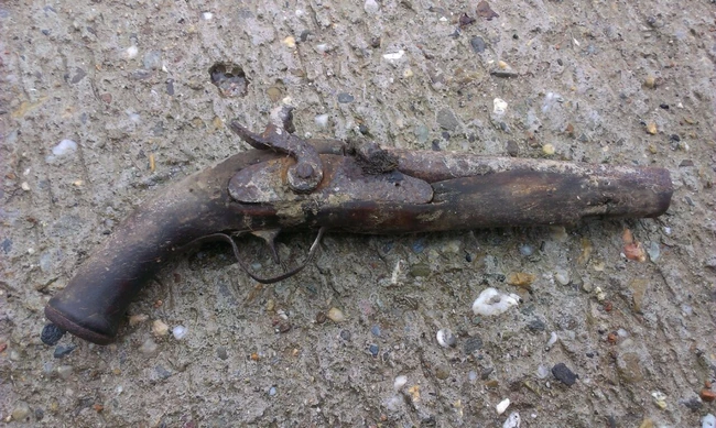 Pistolul cu părţile de lemn deteriorate şi având percutorul rupt a fost scos la suprafaţă de scăderea apelor fluviului Dunărea.
