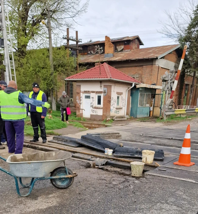 Asfalt bătut la lopată și turnat la găleată, „inovație“ la o trecere la nivel cu calea ferată