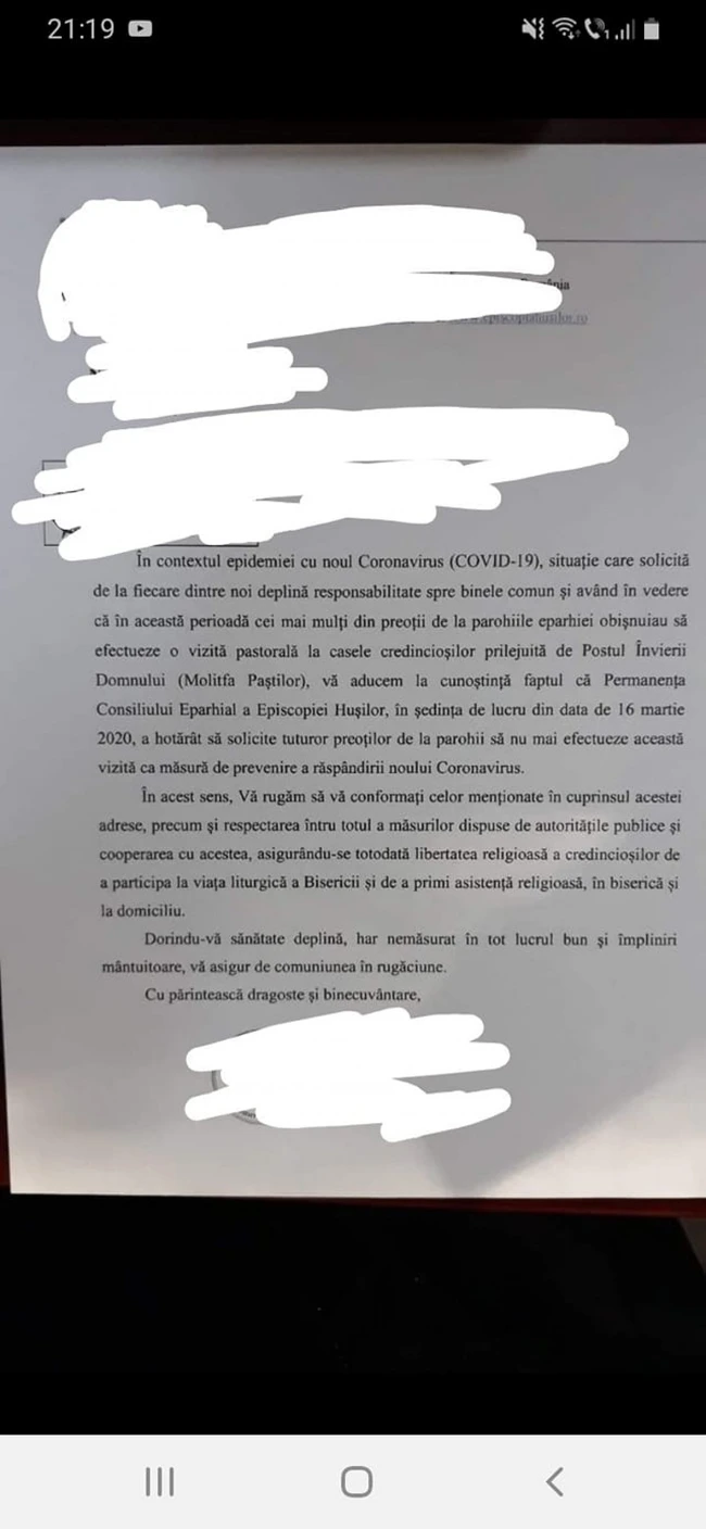”În contextul epidemiei cu noul Coronavirus (COVID-19), situaţie care solicită de la fiecare dintre noi deplină responsabilitate spre binele nostru comun şi având în vedere că în această perioadă cei mai mulţi dintre preoţii de la parohiile eparhiei obişnuiau să efectueze o vizită pastorală la casele credincioşilor prilejuită de Postul Învierii Domnului (Molifta Paştilor), vă aducem la cunoştinţă faptul că Permanenţa Consiliului Eparhial a Episcopiei Huşilor, în şedinţa de lucru din data de 16 martie 2020, a hotărât să solicite tuturor preoţilor din parohii să nu mai efectueze această vizită ca măsură de prevenire a răspândirii noului Coronavirus. În acest sens, Vă rugăm să vă conformaţi celor menţionate în cuprinsul acestei adrese, precum şi la respectarea întru totul a măsurilor dispuse de autorităţile publice şi cooperarea cu acestea, asigurându-se totodată libertatea religioasă a credincioşilor de a participa la viaţa liturgică a Bisericii şi de a primi asistenţă religioasă, în biserică şi la domiciliu”, se menţionează în adresa comunicată preoţilor.