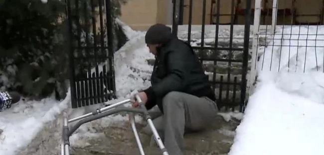 Gest extrem al bărbatului infirm, care se târa pe scări pentru a ajunge la medic. Problema rampei, nerezolvată. Primar: „Investiţia nu se justifică“