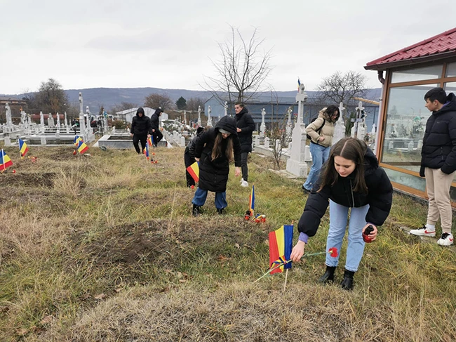 Steaguri tricolore pe mormintele eroilor. Lecția de civism a unor liceeni, de Ziua Națională a României