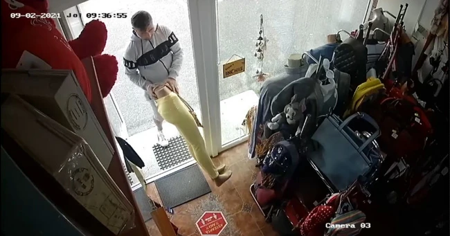 Camera de supraveghere a magazinului îl surprind pe individ pe 2 septembrie, la ora 9.36, când trecea prin faţa uşii, aparent, ca un cetăţean obişnuit. Văzând că uşa magazinului este deschisă şi, aproape de ea, se afla un manechin îmbrăcat cu o pereche de pantaloni galbeni, dar şi cu o poşetă peste ei, brusc se întoarce din drum, se strecoară uşor în interior şi pleacă cu manechinul.