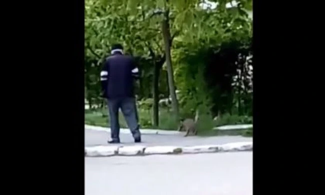 Bârlădeanul nu a ieşit singur la plimbare, ci însoţit de animalul de companie: o pisică legată cu lesă. Dacă pentru bărbat plimbarea pare de relaxare, pentru pisică este un chin.