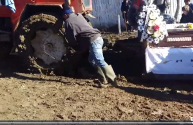 VIDEO Un tractor care transporta un mort la groapă a rămas împotmolit pe un drum sătesc. Cortegiul funerar a răzbătut cu greu spre cimitir