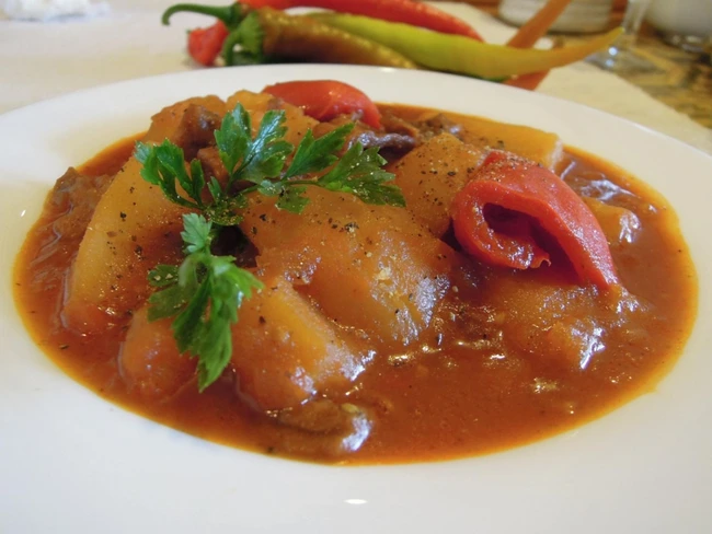 Cartofii tăiaţi felii, în patru, se adaugă în vas, împreună cu apă şi sare. Când sunt aproape gata, se adaugă şi două roşii decojite şi tăiate cuburi şi se asezonează după gust.