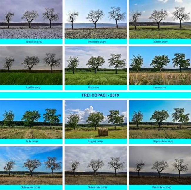 "Mi-am luat reperele în teren - aproximativ la jumătatea parcelei şi în dreptul unei tufe de măcieş - şi am hotărât să revin lună de lună. Aşa s-a şi întâmplat, am reuşit să-mi fac drum pe acolo, în fiecare lună, cel puţin o dată. Nu ştiam ce va urma, ce amploare avea să ia acest proiect. Am luat-o la început ca pe o joacă, însă, treptat, mi-am dat seama că este ceva serios. Asta s-a întâmplat prin martie, când se vedea deja diferenţa în schimbarea peisajului. Cele mai frumoase luni au fost cele de vară, când albastrul cerului, câţiva nori şi lanul de cereale ce a crescut pe acea parcelă au pus şi mai bine în evidenţă copacii. Pe la jumătatea anului am realizat că nu am avut cea mai bună inspiraţie vizavi de poziţia aleasă pentru a-i fotografia. Nu de puţine ori erau în contre jour... Dar era prea târziu să mai schimb ceva", povesteşte Mirel Matyas, care a postat cu regularitate, pe reţelele de socializare, fotografia aferentă fiecărei luni în parte.