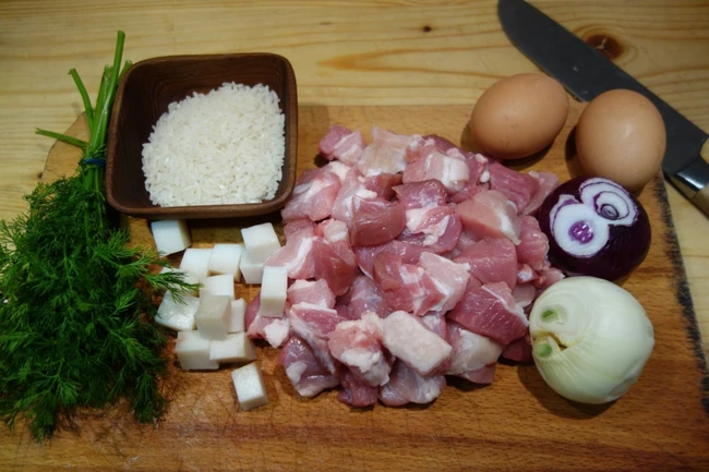 Tocaţi carnea de porc, împreună cu o bucată de slănină afumată. Tocaţi mărunt o ceapă, rumeniţi-o uşor într-o lingură de untură, apoi adăugaţi-o cu carnea tocată şi căliţi încă puţin. Condimentaţi cu sare, piper, cimbru uscat, pastă de ardei sau boia dulce. Amestecaţi încă puţin, apoi luaţi de pe foc şi adăugaţi o ceaşcă de orez fier separat, mărar verde din abundenţă, un ou sau chiar două, cât să se lege carnea.