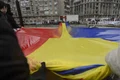 Un tricolor imens a fost întins pe o clădire din zonă, iar pe stâlpii din piaţă au fost montate steaguri.