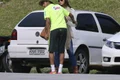 Un arbitru testează spray-ul pentru lovituri libere, pe care-l va purta în şort, de-a lungul partidei. FOTO: Reuters