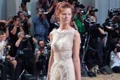 Potrivit dailymail.co.uk, actriţa în vârstă de 43 de ani a atras privirile tuturor în rochia scurtă acoperită de o trenă din dantelă creată de Maria Lucia Hohan.