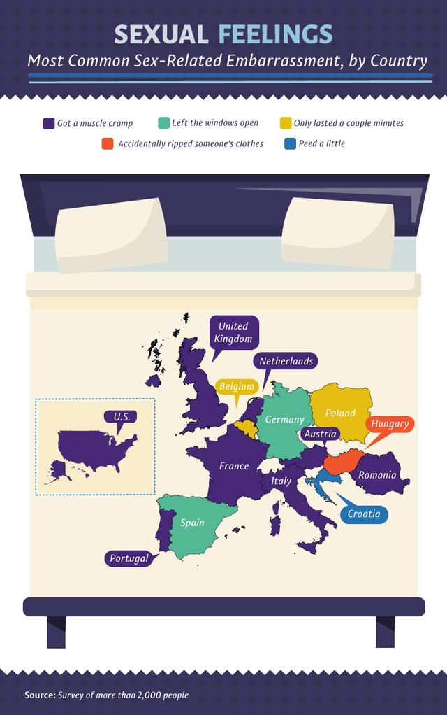 Cele mai multe ţări participante la studiu, inclusiv România, au declarat că cel mai comun lucru jenant a fost confruntarea cu apariţia crampelor musculare. În Ungaria au fost şi respondenţi care au scos din greşeală hainele altcuiva, iar în Croaţia unii parteneri au urinat accidental în timpul actului sexual.