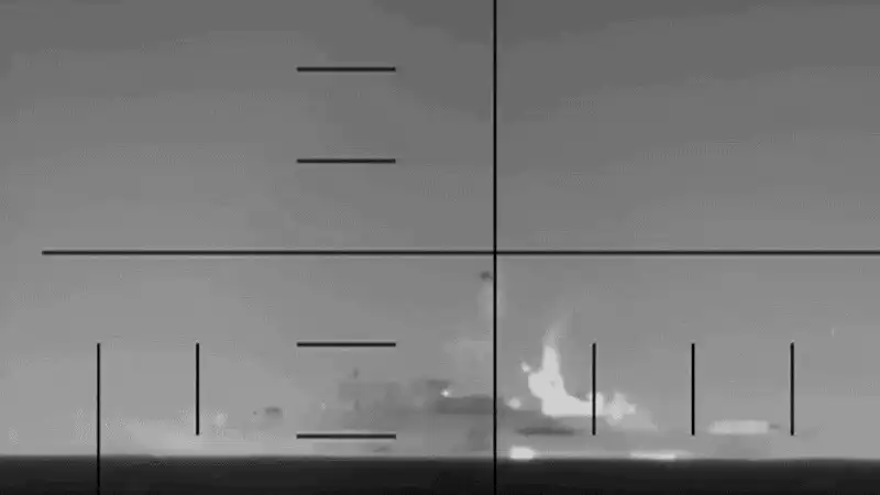 Imaginile prezentate de Pentagon arată momentul în care torpila lovește nava iraniană. La scurt timp după detonare, o coloană uriașă de apă se ridică în partea din spate a vasului, semn că explozia s-a produs sub apă, în apropierea carenei.