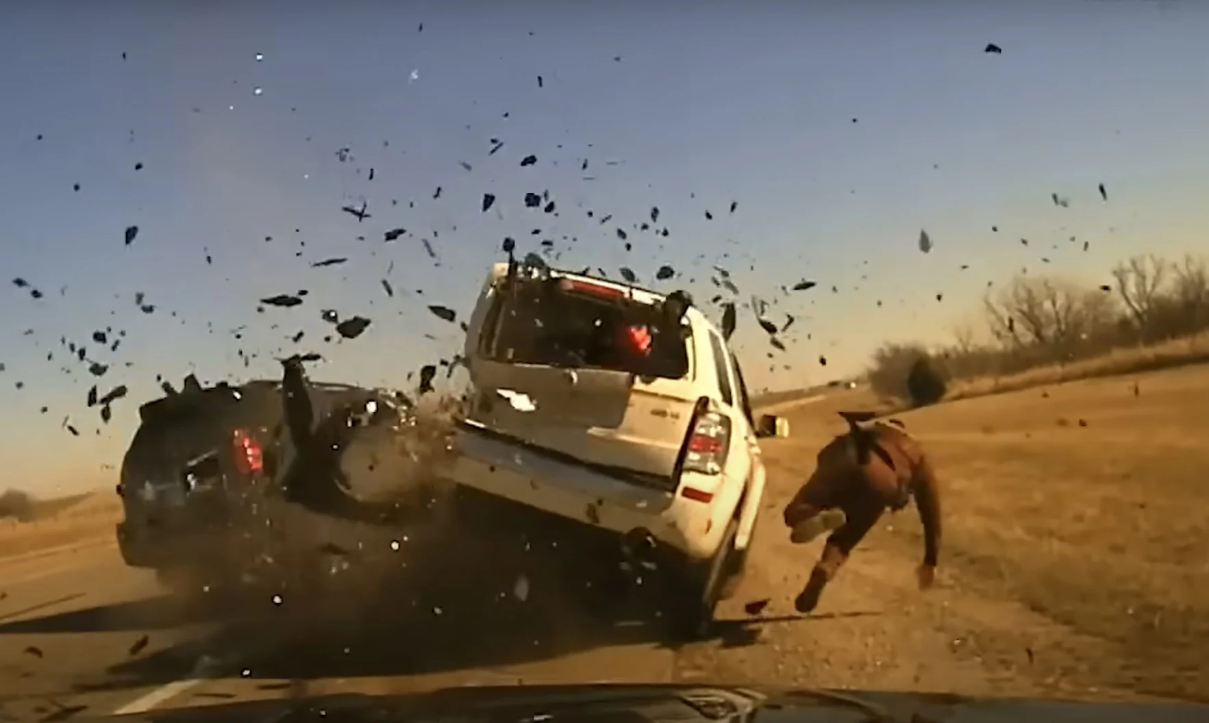În videoclipul ce s-a viralizat pe rețelele de socializare, femeia poate fi auzită țipând și plângând de durere de pe scaunul din față, în timp ce ofițerul Tyler Ingram din cadrul Departamentului de Poliție Mesquite aleargă spre autoturismul cuprins de flăcări de pe marginea autostrăzii, arată imaginile surprinse de camera sa corporală.