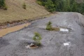 ”De-a lungul traseului s-au observat o serie de degradări specifice drumurilor pietruite: gropi locale, făgaşe, ravene longitudinale, fapt care limitează viteza de circulaţie. Acestea sunt cauzate de lipsa pantelor transversale pe partea carosabilă, fapt care duce la staţionarea apei timp îndelungat pe platforma drumului, apa înfiltrându-se în corpul drumului ceea ce duce la apariţia degradărilor în stratul de balast. Sistemele de colectare, scurgere şi evacuare a apelor sunt deficitare, podeţele sunt parţial colmatate, iar unele au diametru insuficient pentru evacuarea corespunzătoare a apelor pluviale.