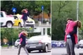 Nicuşor îşi pune în pericol copilul traversând printre maşini.