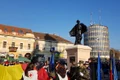 Statuia decapitată de golani, dar folosită festiv ca şi cum nimic nu s-ar fi întâmplat: „Unde doreaţi oare să punem coroana?“