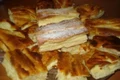 Aluatul se împarte în două, iar o parte se întinde pe o hârtie cerată de mărimea tăvii, se unge cu albuş şi se aşează pe tavă cu tot cu hârtia cerată. O parte dintre fructele mărunţite şi amestecate se pun peste o parte a aluatului, după care se acoperă cu cealaltă parte a aluatului, iar peste toată compoziţia se împrăştie restul de fructe. Pe marginea blatului se pune albuşul şi se presară amestecul de zahăr cu scorţişoară.