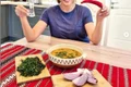 Dacă familia dumneavoastră este formată din cinci persoane sau dacă vreţi să vă invitaţi prietenii la masă, atunci cumpăraţi un kilogram de carne tocată, amestec porc-vită, un kilogram de ceapă, vă mai trebuie 200 de grame de morcov, 400 de grame de orez, 150 de grame de bulion, două legături de pătrunjel şi ulei.