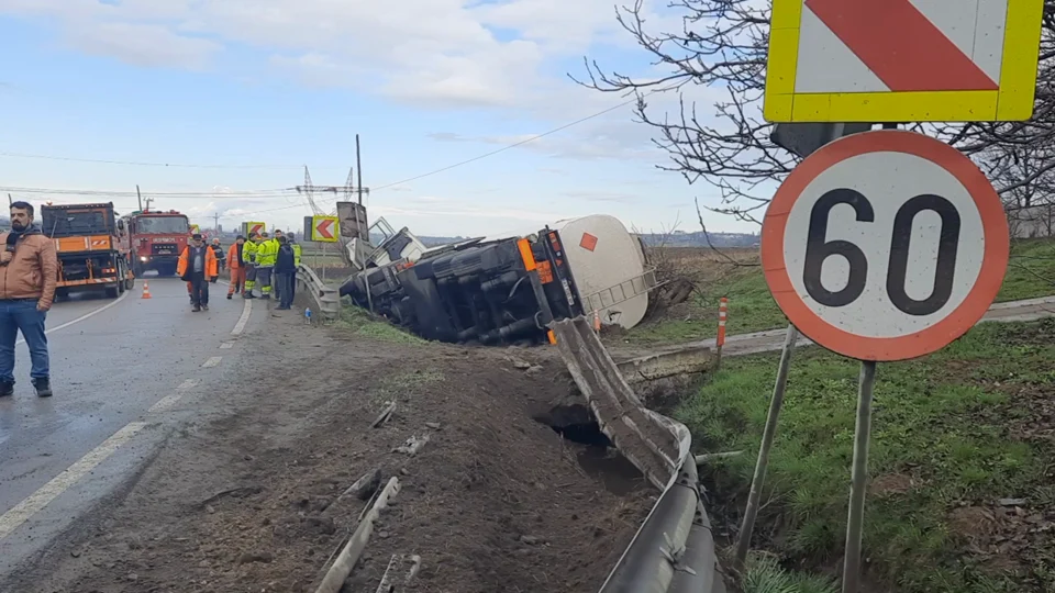 Potrivit acestora, două persoane care s-au aflat în cabina capului tractor au primit îngrijiri medicale, dar au refuzat transportul la o unitate spitalicească, scrie Agerpres.