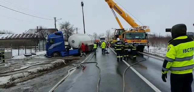 La locul evenimentului va rămâne un echipaj de pompieri cu o autospecială de stingere cu apă şi spumă, până la preluarea încărcăturii de autocisterna trimisă de firma transportatoare, mai precizează sursa citată.
